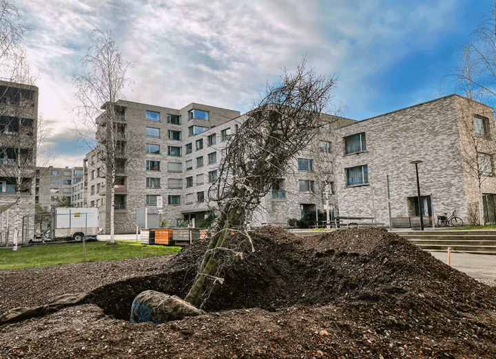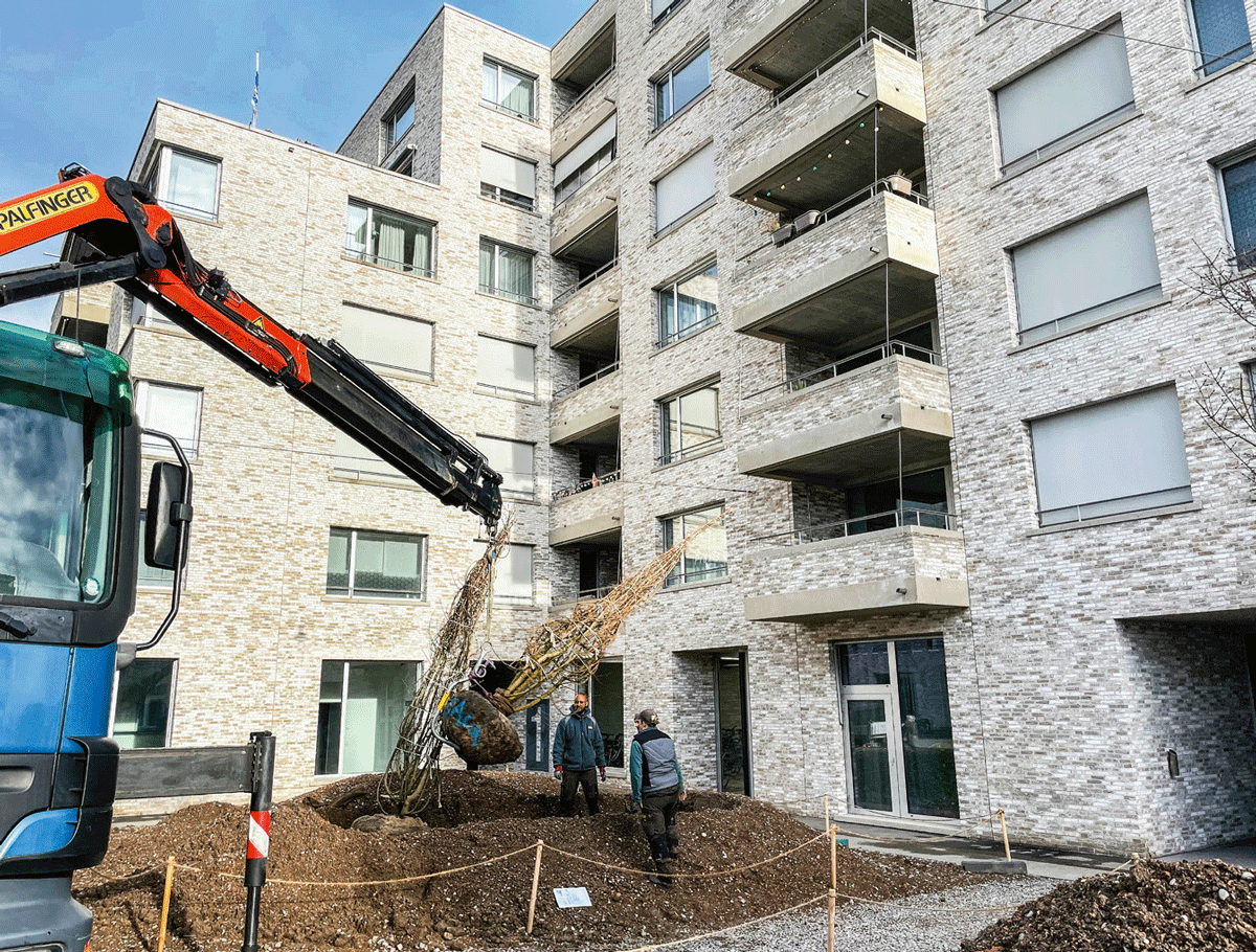 Im Herbst 2021 ging es an die Umsetzung. Seither ist das Dach der Garageneinfahrt entsiegelt und genauso wie die Dächer der Velo-Unterstände mit einem Mosaik verschiedener Stauden begrünt. An fünf Stellen in der Siedlung klettern Hopfen oder Pfeifenwinde als Vertikalbegrünung die Fassade empor. Und die Boule-Bahn ist neu mit einer Pergola überdacht – bis die Kletterpflanzen das Ganze überwachsen, spendet ein provisorisches Netz Schatten. Diesen Frühling wurde die anspruchsvollste und wohl auch wirksamste Massnahme umgesetzt: Vor drei Hauseingängen wurde der Asphalt auf einer Fläche von je rund 200 Quadratmetern aufgebrochen. «Weil sich der Platz über der Tiefgarage befindet, war unter dem Asphalt nur relativ wenig Erde. Dort, wo wir Bäume pflanzen wollten, mussten wir daher grössere Erdhügel aufschütten.» Knapp eine Million Franken hat sich der Sunnige Hof die rund ein Dutzend Klimamassnahmen im Mattenhof kosten lassen, davon rund 150 000 Franken für die Entsiegelung der drei Flächen vor den Hauseingängen.