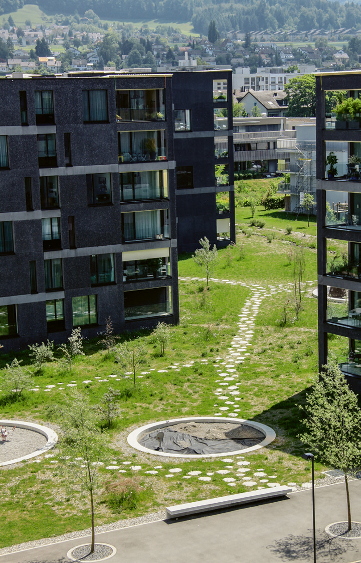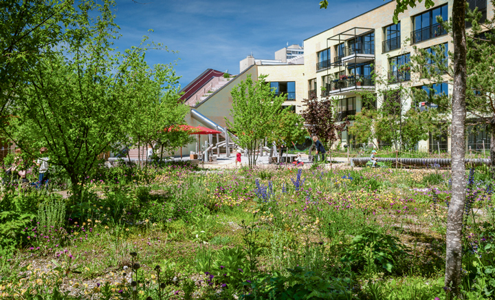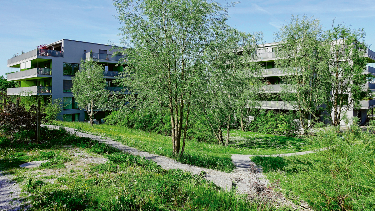 Der grösste Vorteil aber ist, dass Massnahmen zur naturnahen Gestaltung vielfältig, kombinierbar und in verschiedenen Lagen möglich sind, selbst als begrünte Fassade, Fliessgewässer oder Baumgruppe. Und anders als bei der Grün 80 sind heute vielfältige Systemlösungen möglich, es gibt eine hohe Anzahl an standortgerechten Saatmischungen und hoch qualifizierte Landschaftsarchitekturbüros, die auch Erfahrung mit partizipativen Planungsprozessen mitbringen. Drei Beispiele zeigen nachfolgend auf, wie die vielfältigen Ansprüche in neuen Wohnsiedlungen aufgenommen wurden.