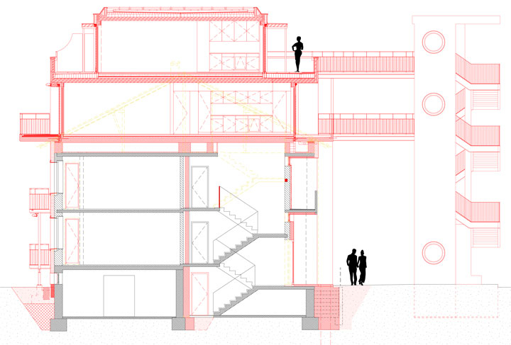 Zwei Zugangsvarianten lösen nun das Problem. Das bestehende Treppenhaus erschliesst weiterhin die alten Wohnungen; es wurde in seiner Struktur belassen, erhielt aber zur Erdbebenertüchtigung verstärkte Rahmungen im Eingangsbereich. In die neuen oberen Geschosse hingegen gelangt man über freistehende Treppen- und Lifttürme, die mit luftigen kleinen Brücken hindernisfrei auf die Laubengänge der beiden Attikageschosse führen. Runde Fenster verleihen den Türmen einen besonderen Charakter und gewähren während der Liftfahrt Ausblicke in die Siedlung.