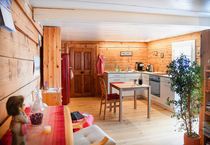 Wo es allerdings noch hapert, zeigt sich im Erdgeschoss, das wir zuletzt besichtigen. Es ist Nicht-Wohnnutzungen vorbehalten und umfasst drei Räume und eine grosse Küche. Gemeinschaftsraum und -küche nutzen die wenigen Bewohnenden allerdings kaum, und Bedarf nach einem Atelier oder Büroplätzen besteht derzeit auch bei niemandem. So wurden externe Gewerbemieter gesucht; demnächst wird als Erstes ein kleiner Bioladen mit Offenverkauf einziehen, der das Angebot im Dorf ideal ergänzt. Und eine Hobbynäherin richtet ihr Nähzimmer ein. Im Mehrzweckraum veranstaltet die MGP-Ost einmal pro Monat «soirées fixes», an denen Dorothee Bachmann Hausbewohner und externe Gäste bekocht. Die Architektin und Baubiologin hat den Umbau geplant und begleitet. Nun engagiert sie sich unter anderem bei der Bewirtschaftung des Bed-and-Breakfast-Studios. Dass die MGP-Ost stärker als vorgesehen beim Hausbetrieb eingespannt ist, findet sie nicht weiter schlimm. «Das gehört zum Lernprozess.»