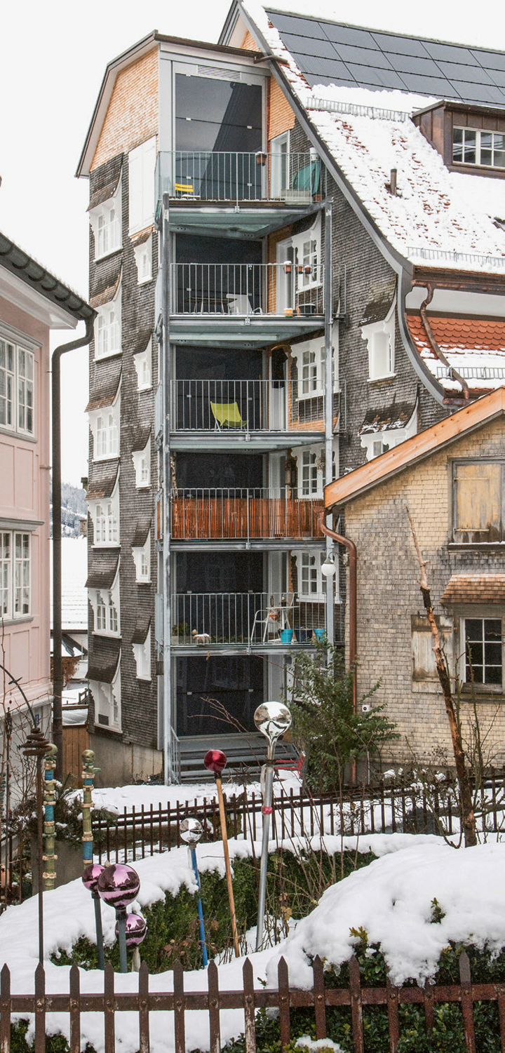 Ein Grund dafür ist der Bewohnermix. Zwar gibt es in der Alten Drogerie sechs unterschiedlich grosse Wohnungen, bei der Vermietung hatte die MGP-Ost aber Pech: Zwei vom Projekt sehr überzeugte Familien mit Kindern mussten verzichten – beide Männer sind für die appenzelltypisch niedrigen Räume schlicht zu gross. Eine Mutter mit kleinem Sohn ist nach einem Jahr wieder zurückgekehrt nach Zürich, wo ihr Partner lebt. Andere Familien liessen sich nicht finden, und nachdem zwei Wohnungen mehrere Monate leer gestanden hatten, vergab man die eine schliesslich nach einer Verkleinerung einer Alleinlebenden und die andere einem Vater, dessen Kinder temporär bei ihm wohnen. Damit leben nun drei Pensionierte und drei Berufstätige in der Alten Drogerie. Letztere sind zeitlich wenig verfügbar. Immerhin, meint Irene Fischbacher, koche man ab und zu füreinander, und sie gehe regelmässig mit einer anderen Bewohnerin spazieren oder wie eben vorhin Kaffee trinken. Für eine Unterhaltung hat sie jetzt aber keine Zeit mehr – sie hat eine Aufgabe übernommen und muss noch das Bed-and-Breakfast-Studio herrichten, es wird ein Gast erwartet. Darum entschwindet sie in den ersten Stock.